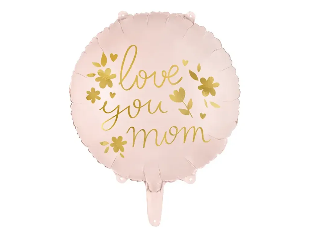 Rund folieballong i rosa med guldtexten "love you mom". Kan fyllas med helium eller luft.