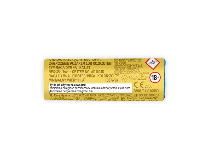 Säkerhetsföreskrifter och varningar: Endast för utomhusbruk. Får endast användas av personer över 18 år. Håll ett säkerhetsavstånd på minst 8 meter. Ska placeras på marken på ett icke-brännbart underlag; får aldrig hållas i handen på grund av extrem värmeutveckling. Rikta aldrig mot människor, djur eller brännbara föremål. Undvik inandning av rök.