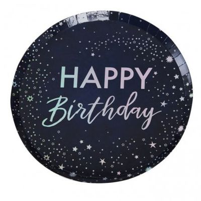 Coola papptallrikar från temat "Stargazer" i färgen marinblå med silvriga detaljer och text.