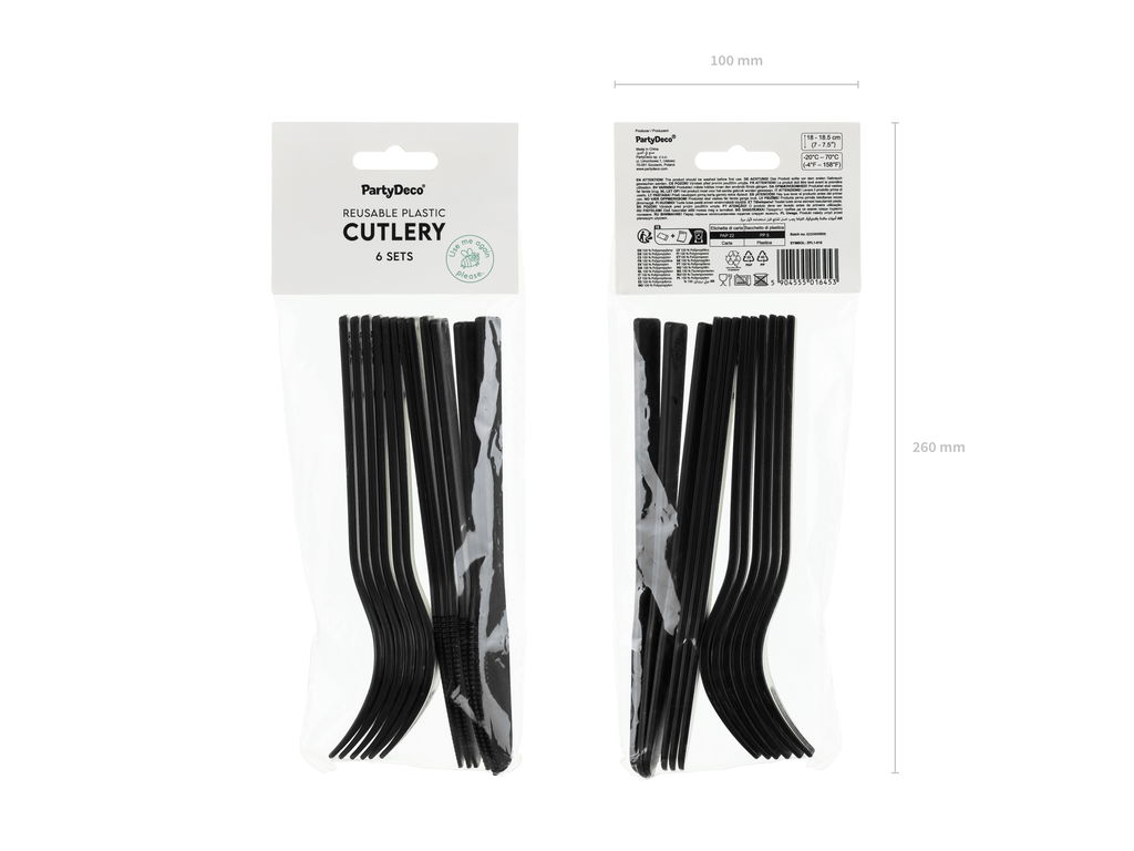 Plastbestick i svart. Perfekt för dukning till grillfesten eller annan festlighet. måtten ca 18 x 18,5 cm. Setet innehåller 6 knivar och 6 gafflar. Besticken är återanvändningsbara.